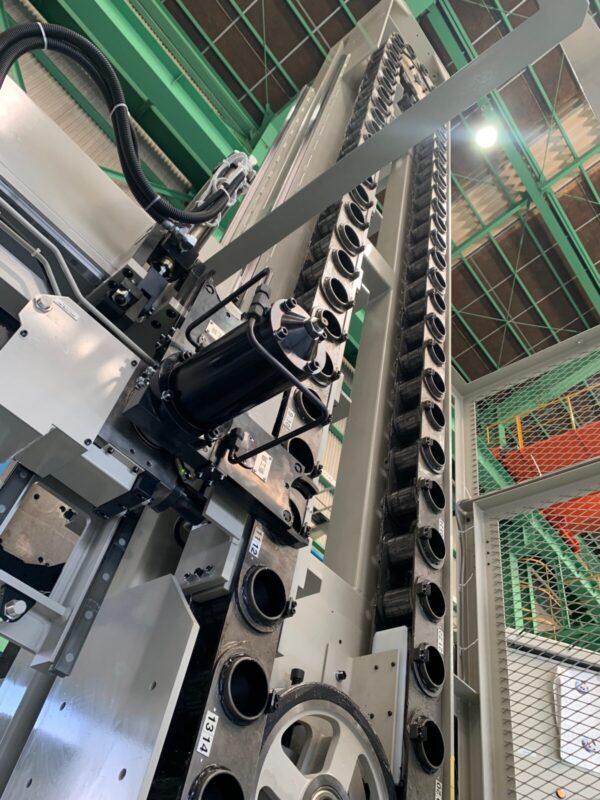 垂直方向の主軸と水平方向のチェーンタイプマガジンの工具交換を可能にするため、チェンジアームユニットを90度倒す仕様とし、これにより主軸とマガジンの工具方向を同じにする必要がなくなり省スペース化やレイアウトの自由度が増しました。